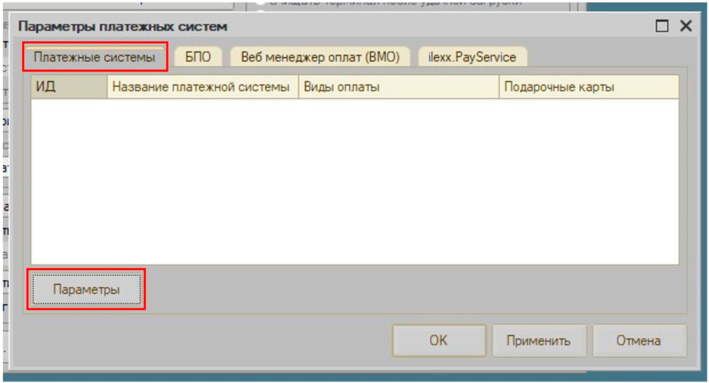 На вкладке "Платежные системы" нажимаем кнопку "Параметры"