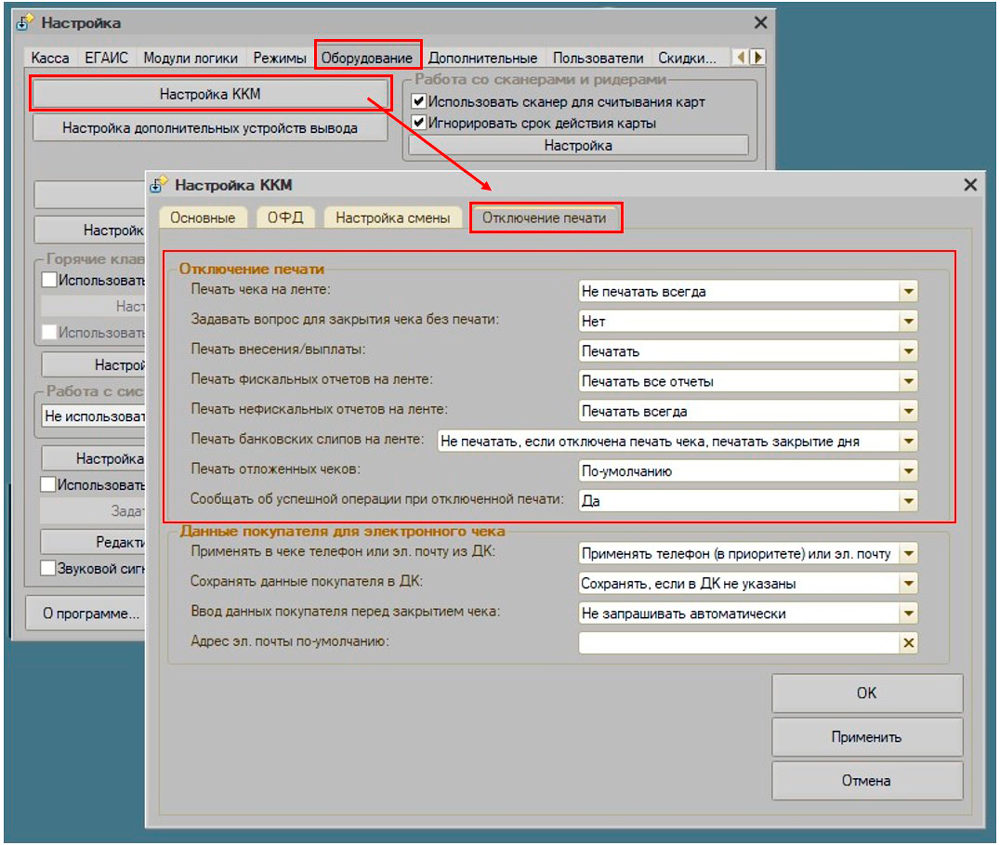 Тут можем тонко настроить варианты отключения печати чека.