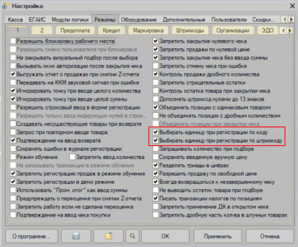 Для продажи другой единицы товара, необходимо установить константы "Выбирать единицу при регистрации по коду" и "Выбирать единицу при регистрации по штрихкоду" ("Настройки" - "Режимы" - "1")