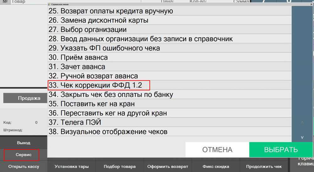 Для его формирования необходимо в режиме регистрации продаж вызвать функцию "Сервис" и выбрать "Чек коррекции ФФД 1.2".