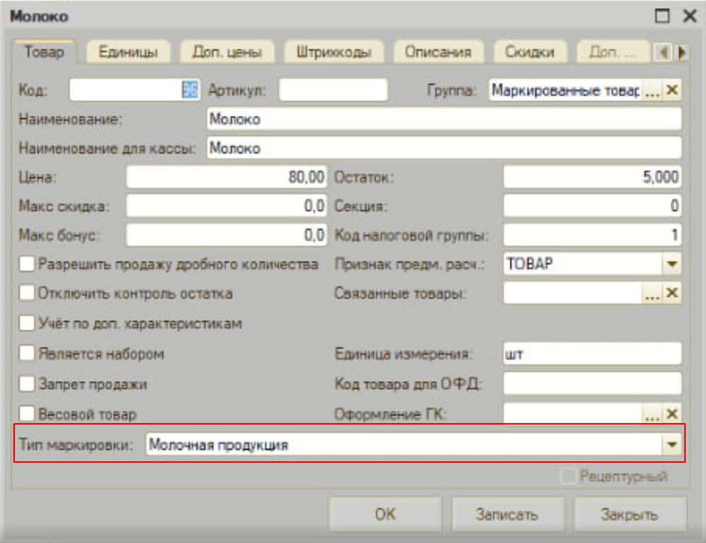 Важно!!! В карточке товара ("Настройки" - вкладка "Касса" - "Товары") должен быть указан тип маркировки.