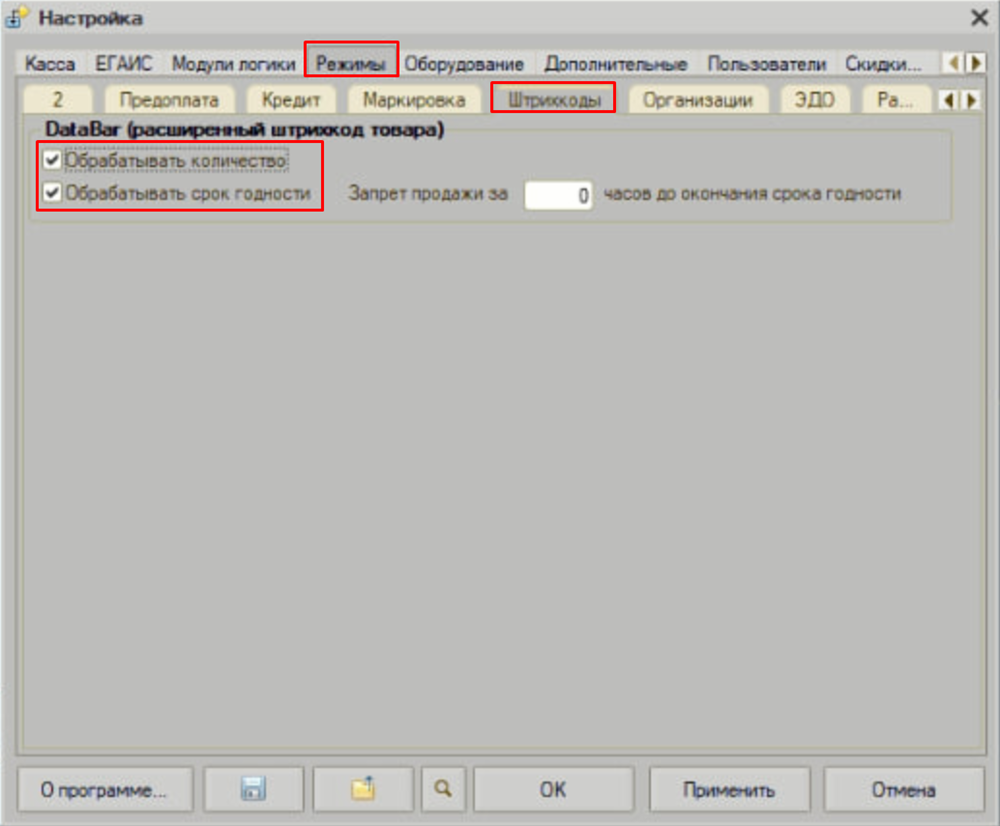 Для создания штрихкода, который может передавать количество и срок годности в первую очередь необходимо включить константы "Обрабатывать количество" и/или "Обрабатывать срок годности" ("Настройки" - "Режимы" - "Штрихкоды"), в случае со сроком годности дополнительно можно указать за сколько часов запретить продажу до окончания срока годности.